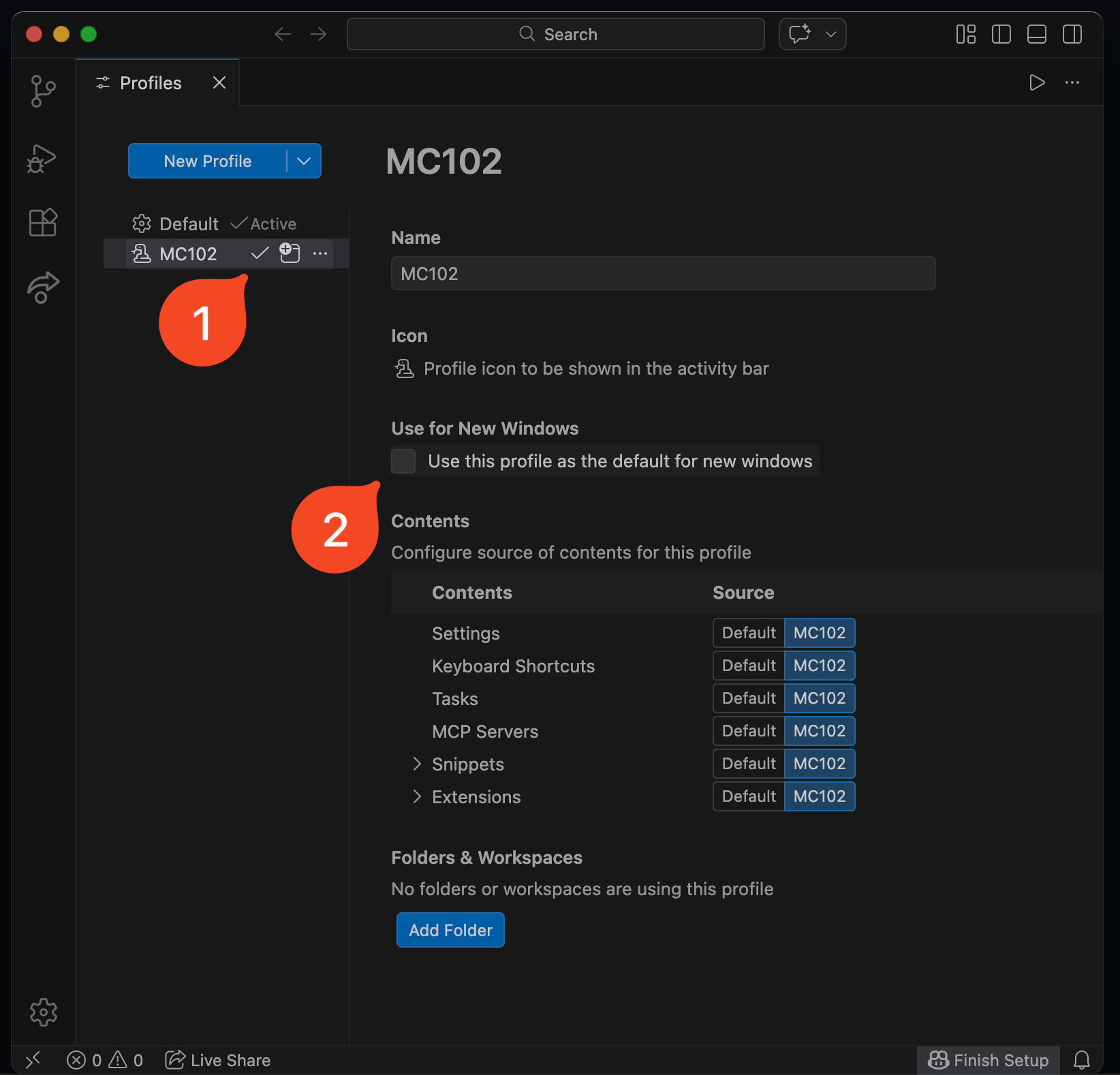 Agora, basta definir como o perfil da seção atual clickando no checkmark e como o perfil padrão clicando na checkbox .